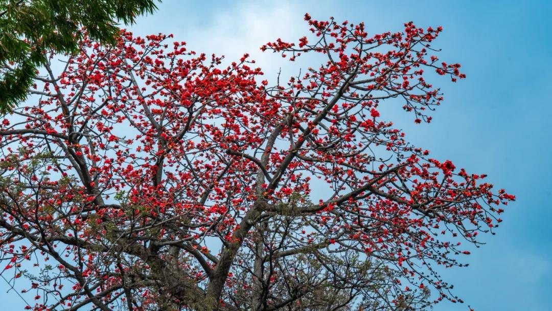 攀枝花盛開時,沒有綠葉襯托,也沒有含苞待放的羞澀,大朵大朵的紅艷動人,暢游樹下,可感受到濃濃的春天氣息。