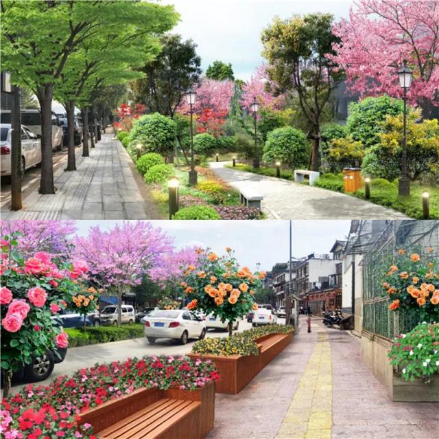 在雪山路的設(shè)計(jì)中,北段將以原有的櫻花大道為基礎(chǔ),對道路景觀進(jìn)行優(yōu)化改造,將中央綠化帶的喬木替換為櫻花,移除原有部分桂花樹,并對地被灌木優(yōu)留劣替,增植月季等多年生景觀花卉,增加攝影點(diǎn),使櫻花大道的美名更勝。替換花池內(nèi)原有苗木,以混色月季替代,并對周邊變電箱等裝置進(jìn)行美化處理,提升路口的景觀效果。