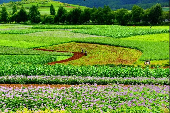 太安的洋芋花分別是:白色、粉色、紫色,3個(gè)不同的色彩,一朵朵的小花,就像一個(gè)情竇初開(kāi)的少女,羞澀惹人愛(ài)。哈哈,雖然你吃過(guò)土豆,但是你有見(jiàn)過(guò)如此大片三色彩的花海嗎?一行人漫步在色彩斑斕的三色世界,走在花間小道,隨處可見(jiàn)的游客,在田間嬉戲拍照,輕輕撫摸花枝,俯下身細(xì)聞洋芋花粉的獨(dú)特味道,香氣撲鼻。站在小山峰俯瞰整個(gè)的洋芋花海,藍(lán)天白云的天,和五顏六色的花海?;ê吞炜眨瑑煞N鮮明的顏色,搭配在一起,讓眼前的景變成了一張美麗的明信片。